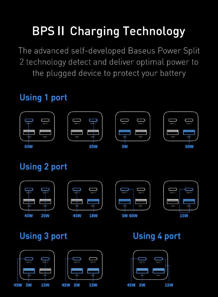 | Плюсы: | 4 порта, 65 ват, Baseus, качество провода, самой зарядки |