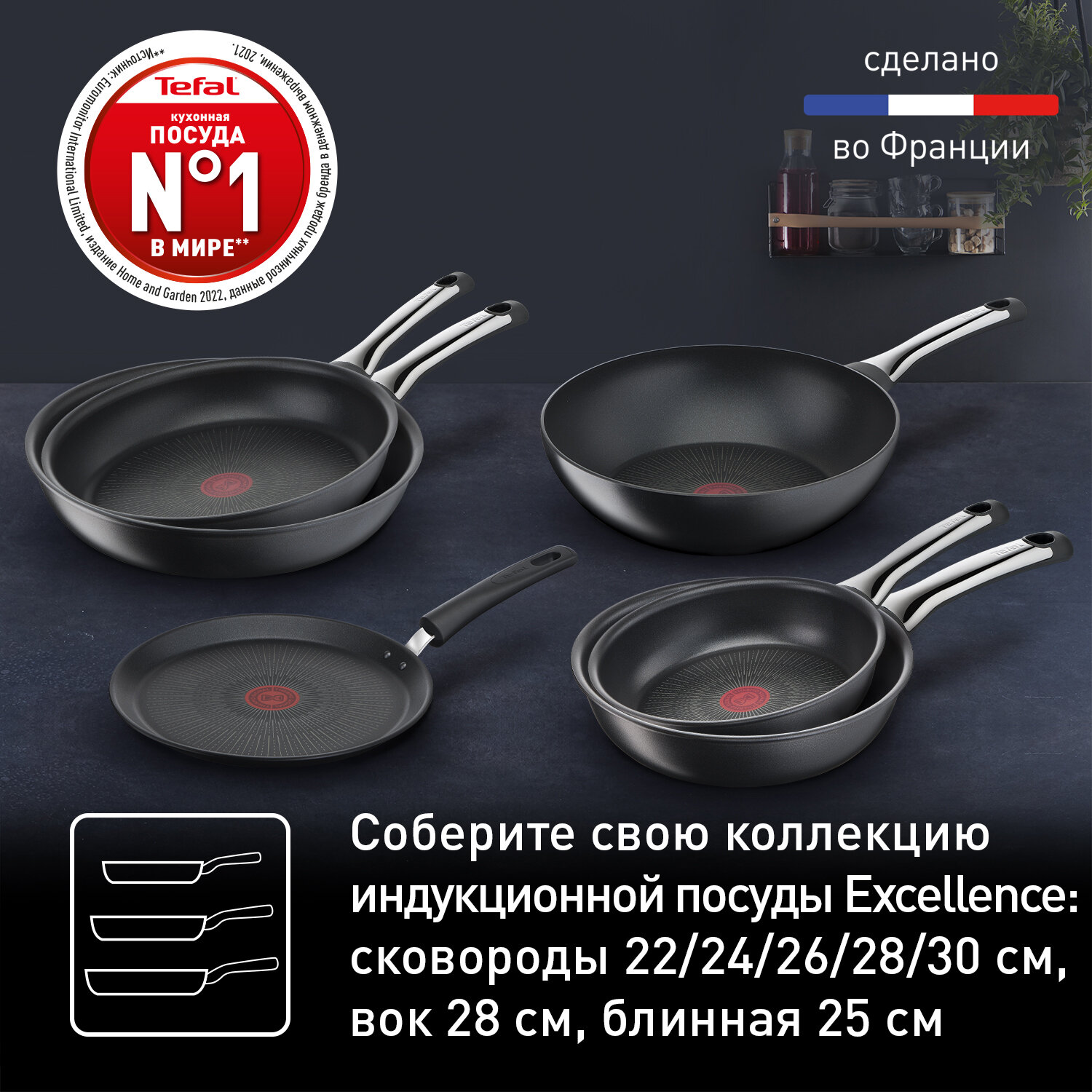 Сковорода Tefal Excellence G2690372, диаметр 22 см, с индикатором температуры, глубокая с антипригарным покрытием, для газовых, электрических и индукционных плит, сделано во Франции
