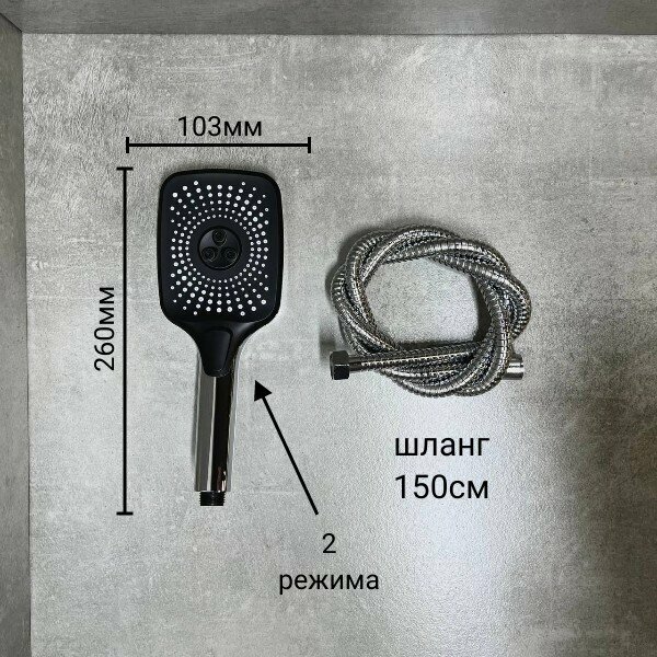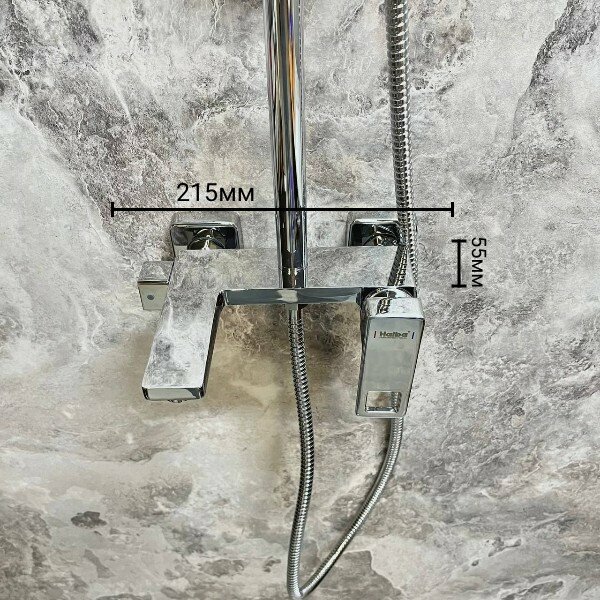 | Комплектация | Смеситель; Душевая стойка; Верхний душ; Кронштейн для верхнего душа; Держатель лейки; Душевая лейка 2 режима; Душевой шланг 1,5м.; Крепления; Отражатели; S-образные Эксцентрики 2шт. / Гарантийный талон. |