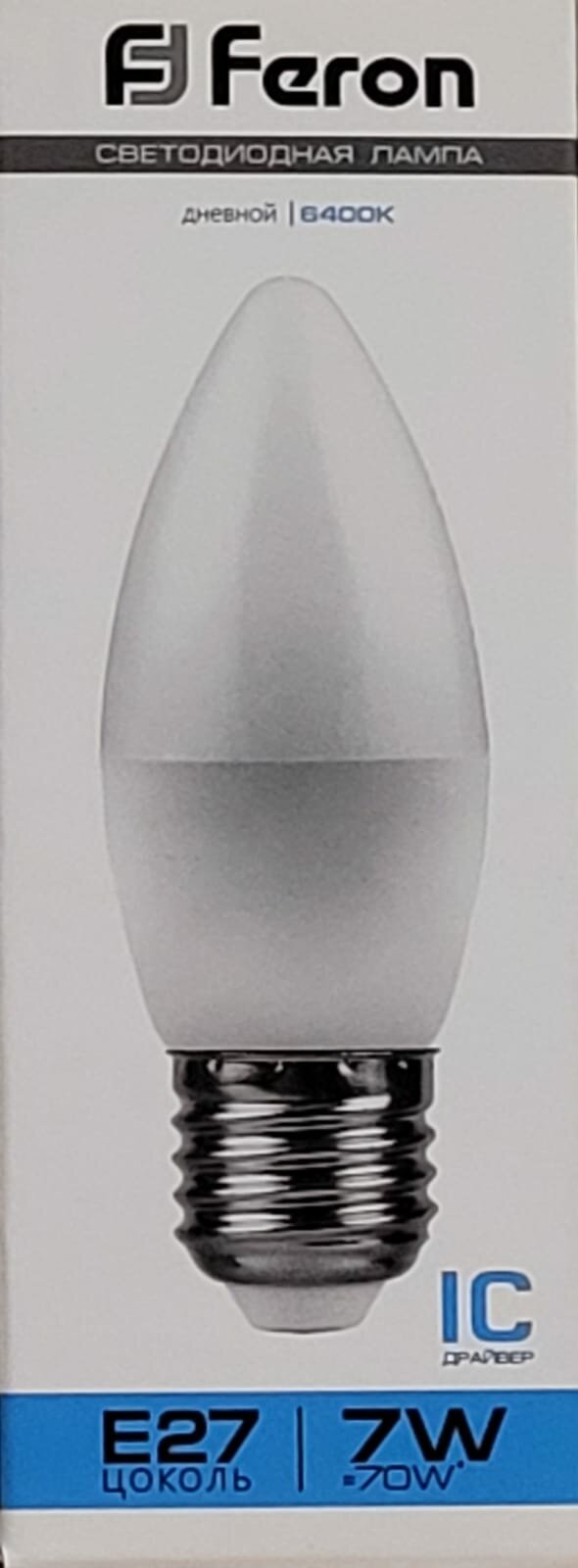 Лампа светодиодная FERON, (7W) 230V E27 6400K C37, LB-97 9786647
