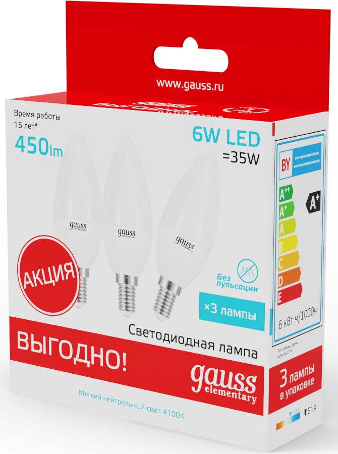 Купить Лампа светодиодная Elementary 6Вт свеча 4100К нейтр. бел. E14 450лм промо (уп.3шт) GAUSS 33126T