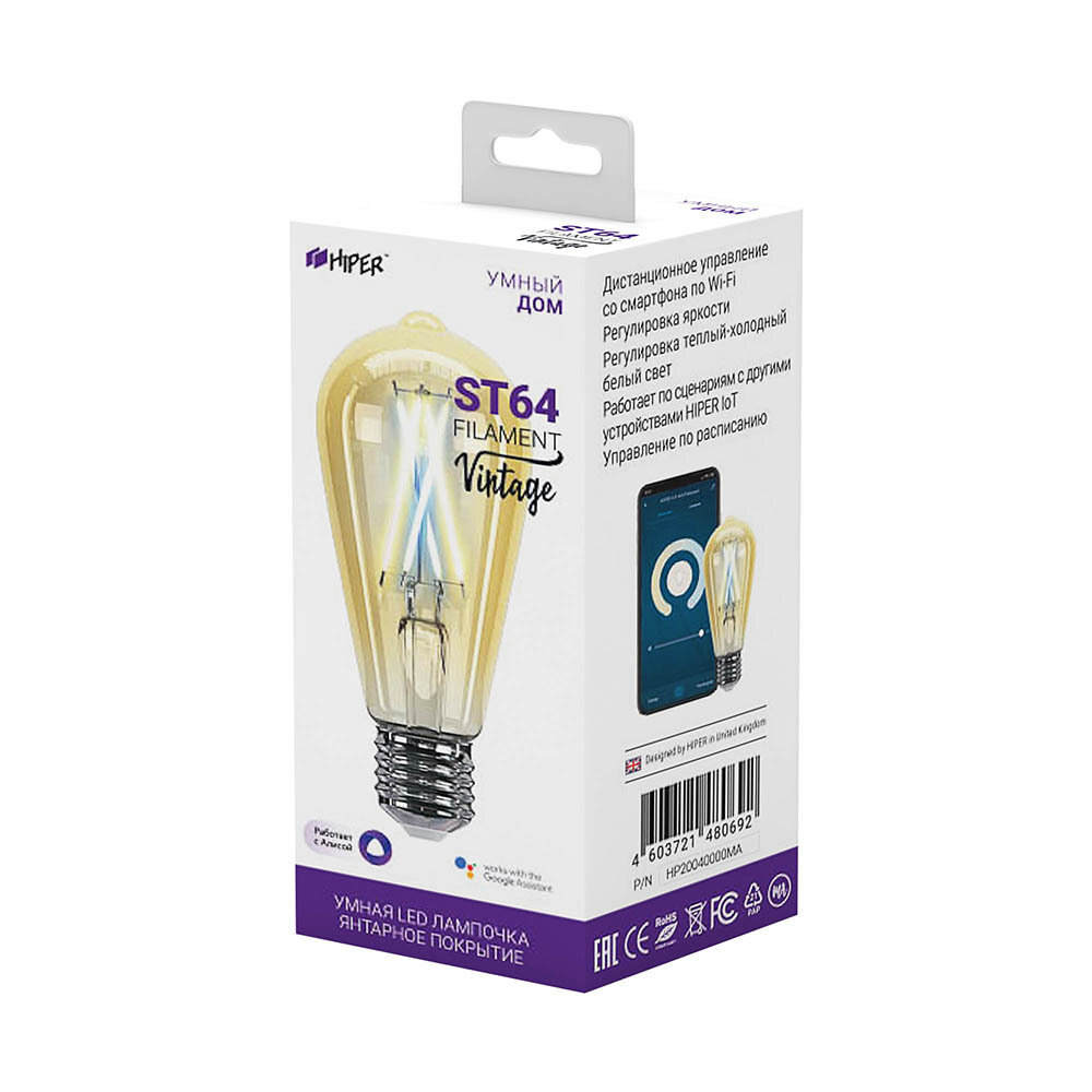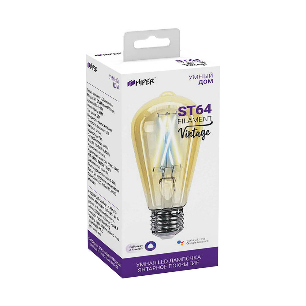 Умная лампа HIPER Wi-Fi E27 IoT ST64 Filament Vintage, теплый-холодный белый свет, янтарное покрытие