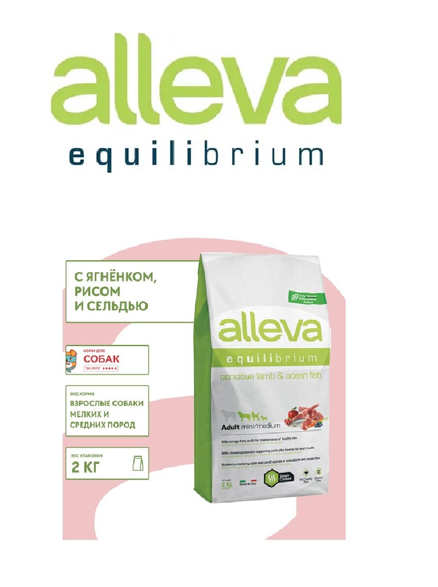 Сухой корм для собак ALLEVA EQUILIBRIUM SENSITIVE LAMB AND OCEAN FISH ADULT MINI/MEDIUM Аллева Корм для взрослых собак мелких и средних пород Эквилибриум Сенситив с ягненком и океанической рыбой 2 кг