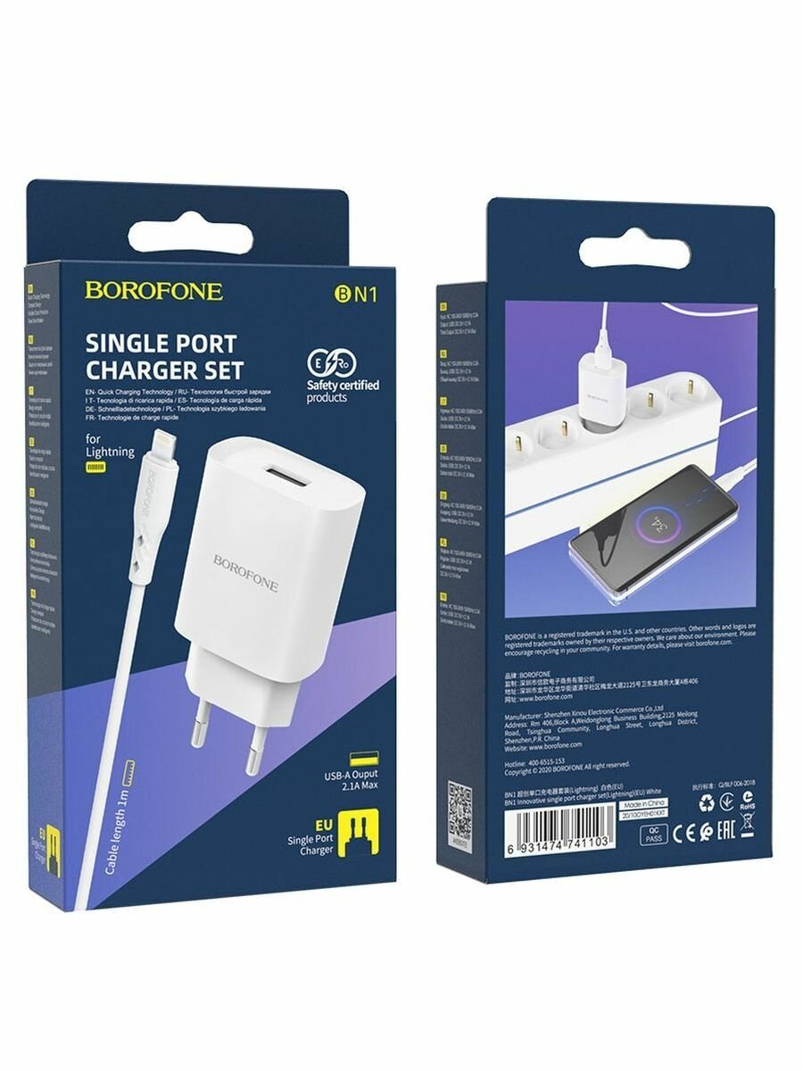 Зарядное устройство BOROFONE BN1 Innovative USB + Кабель USB-Lightning, 2.1A, белый