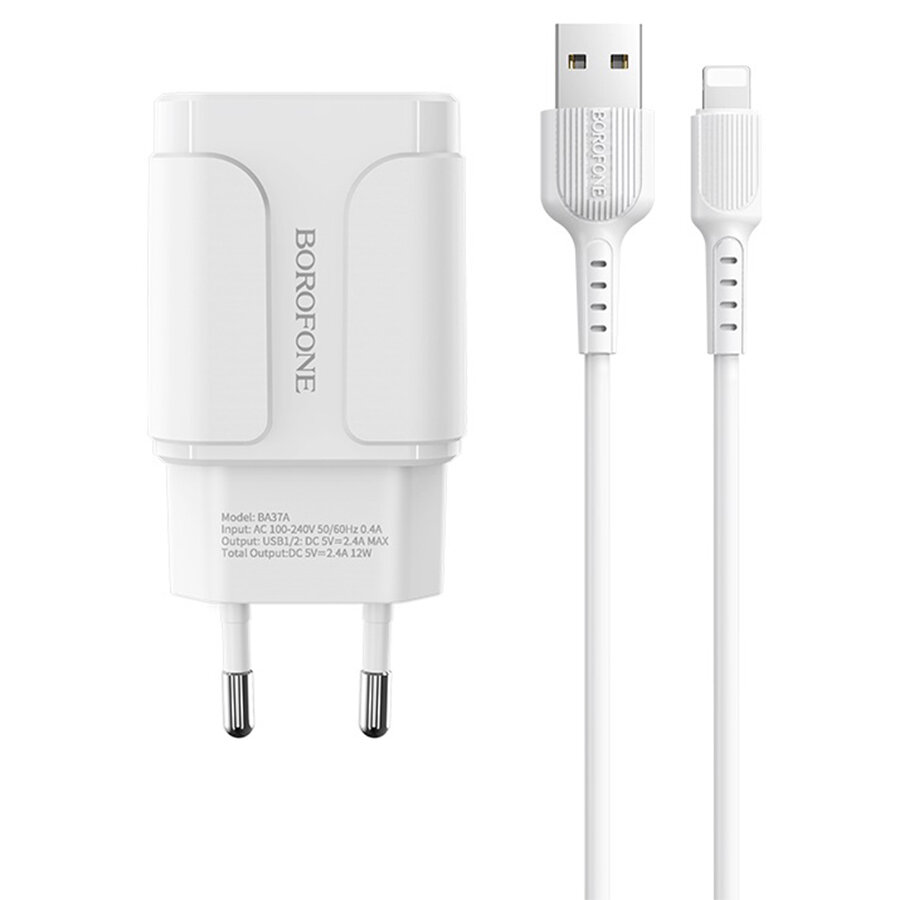 Сетевое зарядное устройство (СЗУ) Borofone BA37A (2 USB) + кабель Lightning, 2.4 А, белый
