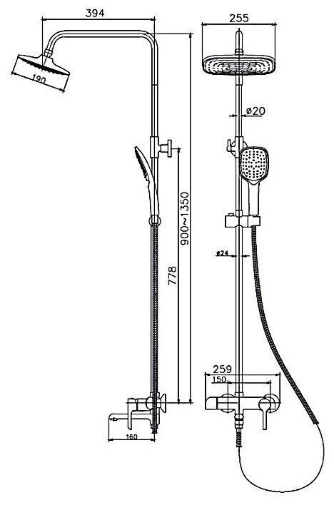 | Комплектация | Смеситель с изливом; Душевая стойка; Верхний душ; Кронштейн для верхнего душа; Держатель лейки; Душевая лейка; Душевой шланг; Крепления |