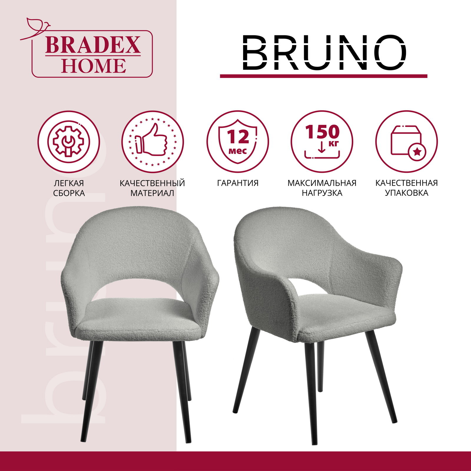 Стул для кухни Bruno винный / Стулья для кухни / Кухонные стулья со спинкой / Стул кресло / Кресло на балкон / Стулья для гостиной / Мебель лофт