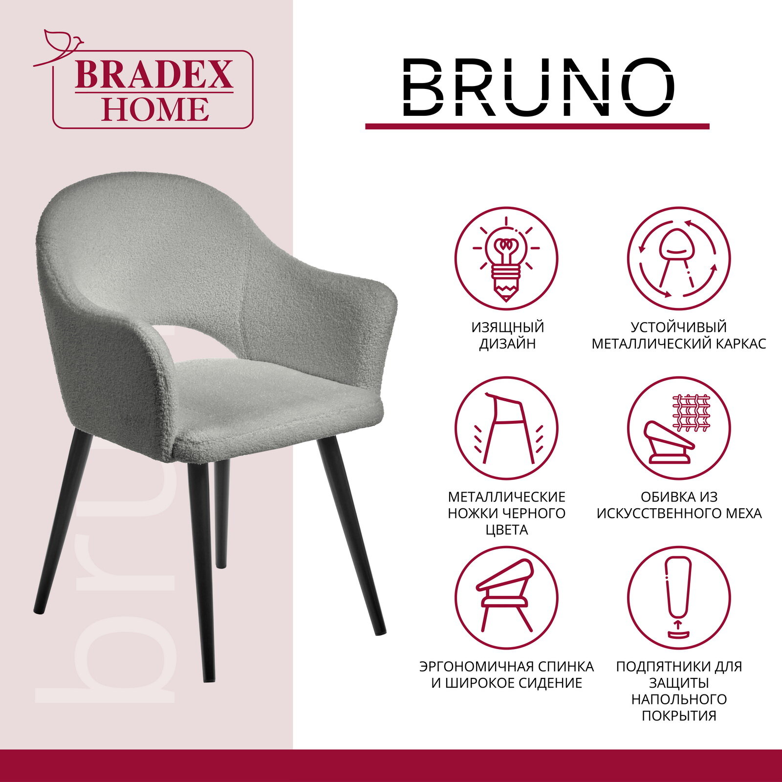 СохранитьСтул кресло для кухни и гостиной мягкий велюр со спинкой Bruno светло-серый, искусственный мех интересное: