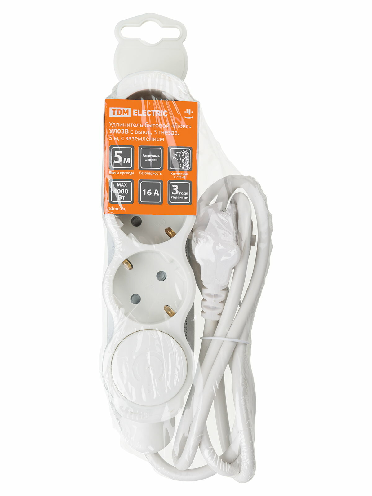 Удлинитель бытовой "Люкс" УЛ03В выкл, 3 гнезда, 5м, с/з, с з/ш, ПВС 3х1мм2 16А/250В бело-серый TDM