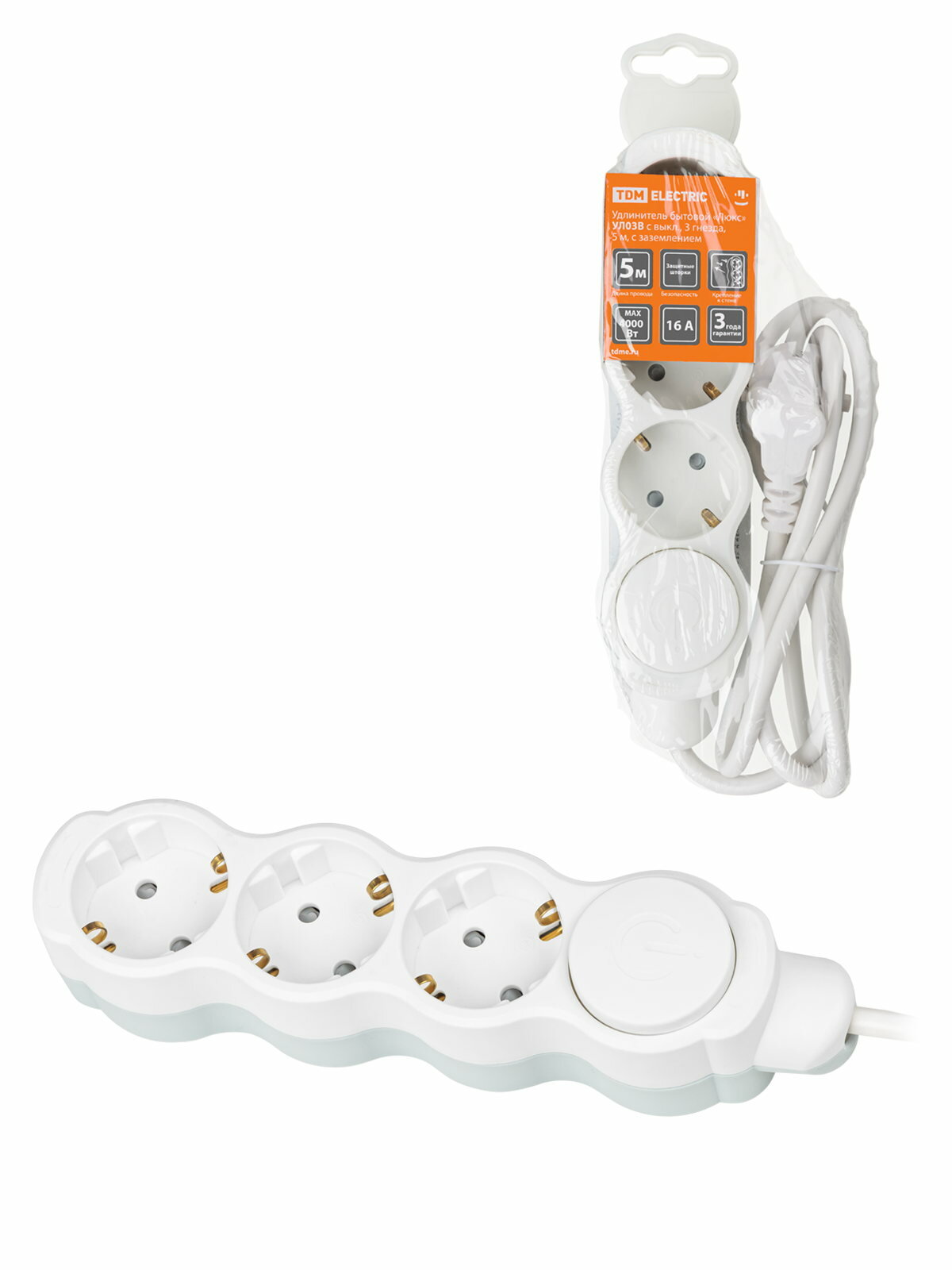 Удлинитель бытовой 3 гн, 5 м, ПВС, 3х1 мм2, с/з, 16 А, выкл, 250В,с з/ш, бело-сер, TDM, Люкс УЛ03В,
