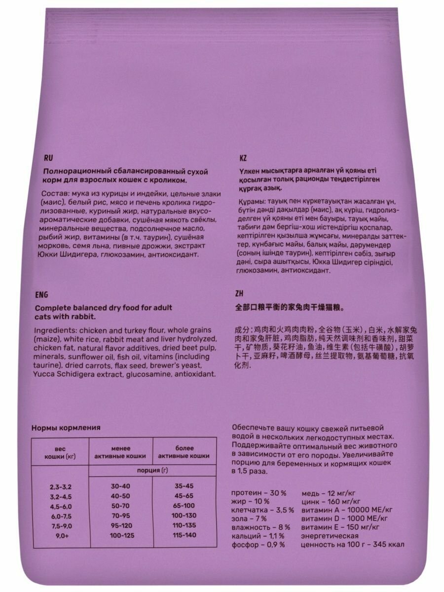 | Состав | мука из курицы и индейки, цельные злаки (маис), белый рис, мясо и печень кролика гидролизованные, куриный жир, натуральные вкусо-ароматические добавки, сушёная мякоть свёклы, минеральные вещества, рыбий жир, витамины (в т.ч. таурин), сушёная морковь, семя льна, пивные дрожжи, экстракт юкки Шидигера, глюкозамин, антиоксидант |
