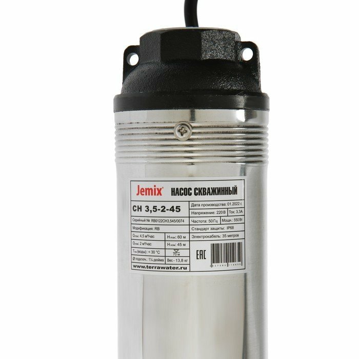 Насос скважинный, Jemix, 35 м, 550 Вт, диаметр 87 мм, 60 м, максимальный напор 45 м, 2 м³/ч, СН 3,5-2-45