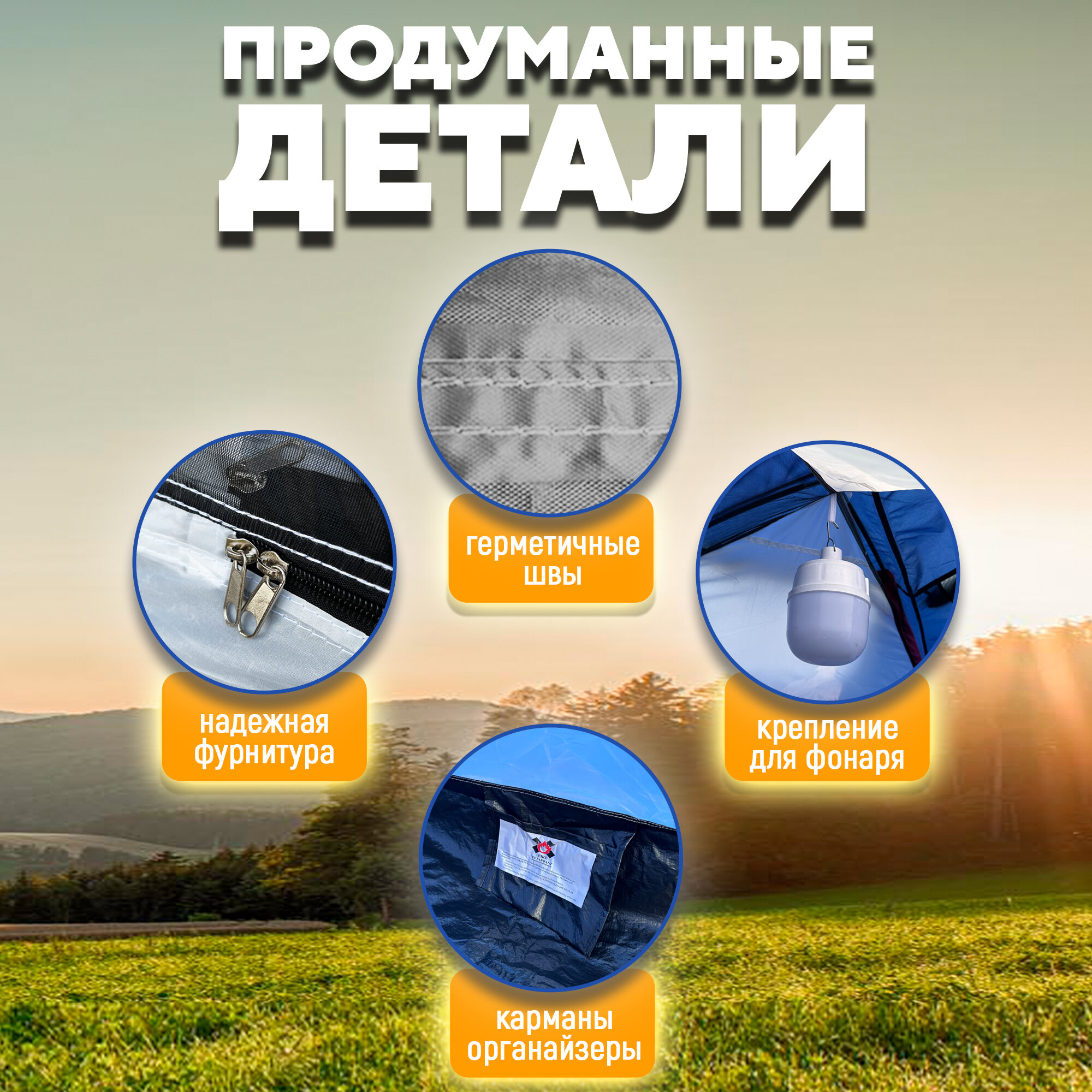 | Особенности | УФ-защита / вентиляционные отверстия / ветрозащитная/снегозащитная юбка / внутренние карманы / внутренняя палатка / навес / окна / проклеенные швы / тент |