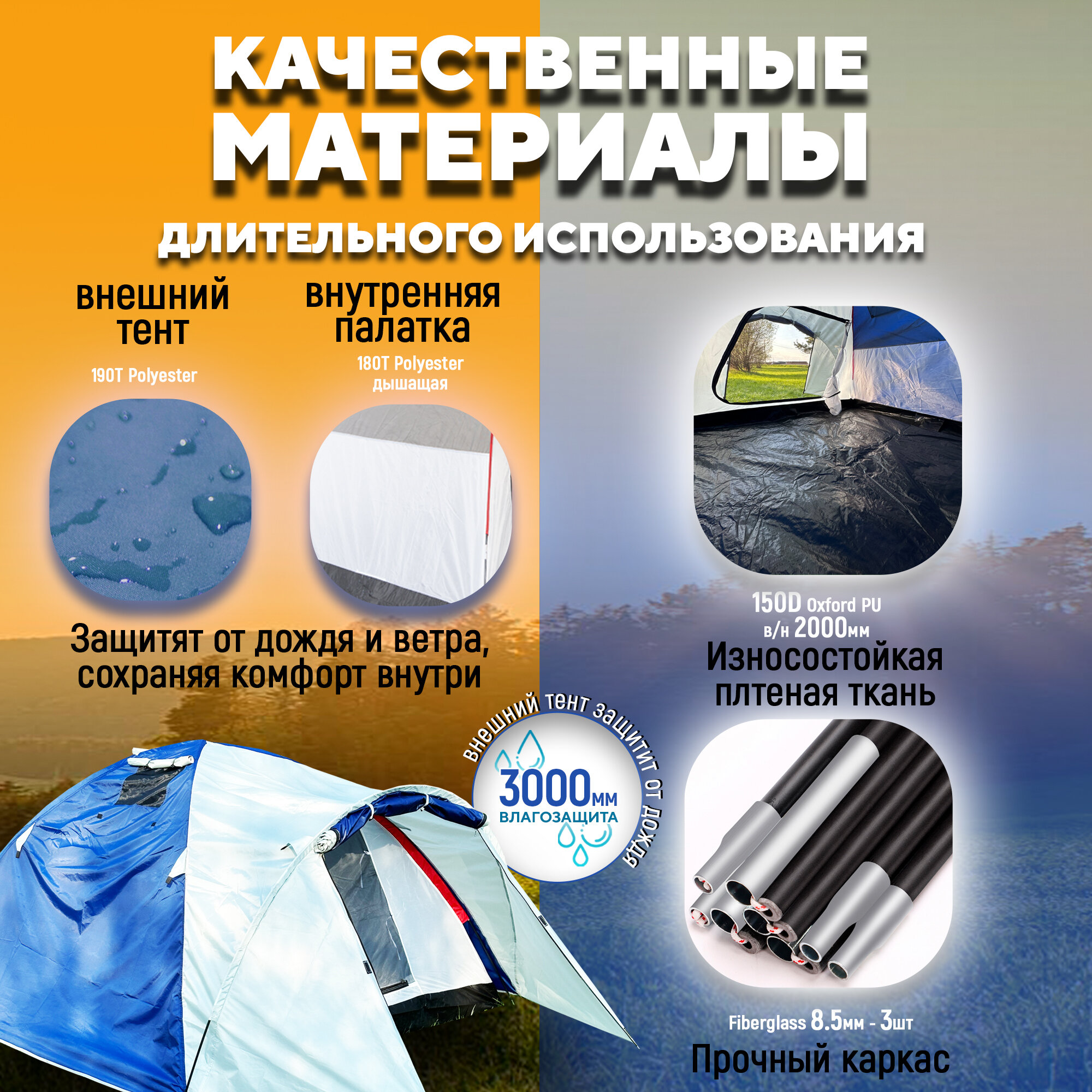 | Водостойкость тента/дна | 3000 / 2000 мм в.ст. |