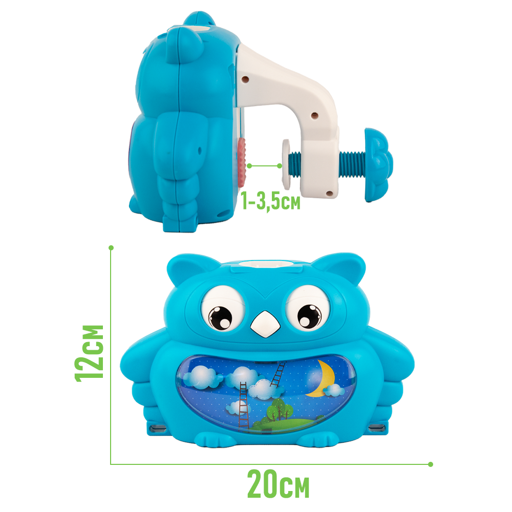 | Отзыв: | пришел в ужасной коробке, плёнка будто порезана, ручка оторвана, на подарок точно бы не подошёл. Сам мобиль неплохой, сборка легкая. Ночником в виде совы не пользуемся, т.к. света от неё совсем нет, просто яркий синий цвет. Мелодии не громкие, есть звуки сердцебиения, наклон регулируется. |
