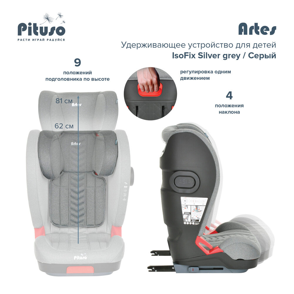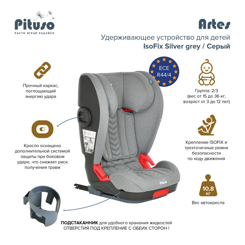 Детское автокресло группы 2/3 15-36 кг Pituso Artes Silver grey/Серый удерживающее устройство от 3 до 12 лет, Isofix, изофикс интересное: