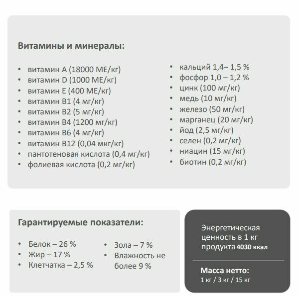 | Минеральные вещества | люкозамин 400 мг, хондроитин 100 мг, Омега 3 – 0,38 %, Омега 6 – 2,8%. Минералы на 1 кг: кальций 1,4 - 1,5%, фосфор 1 - 1,2%, цинк 100 мг, медь 10 мг, железо 50 мг, марганец 20 мг, йод 2,5 мг, селен 0,2 мг. |