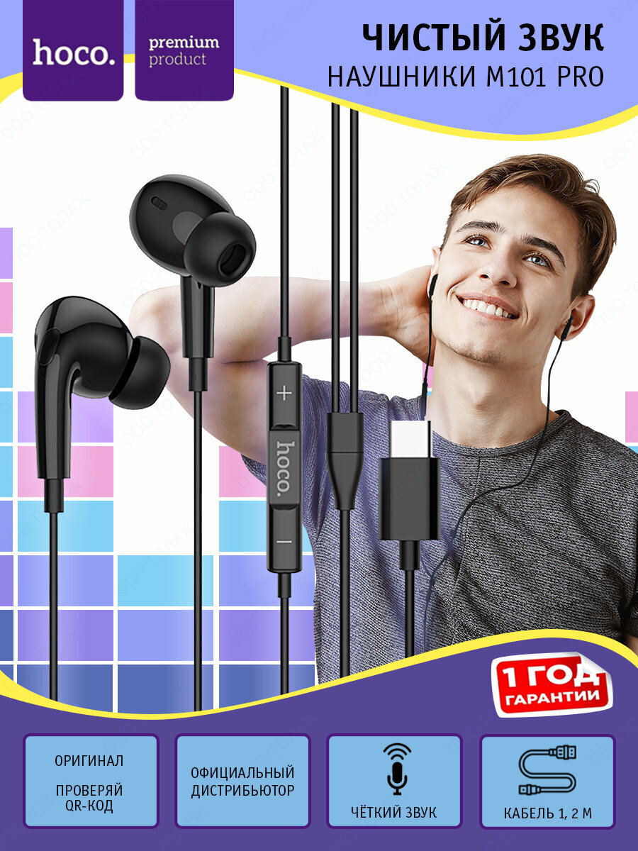 Проводные наушники M1 Pro, Type-C, HOCO, вакуумные с микрофоном, черные
