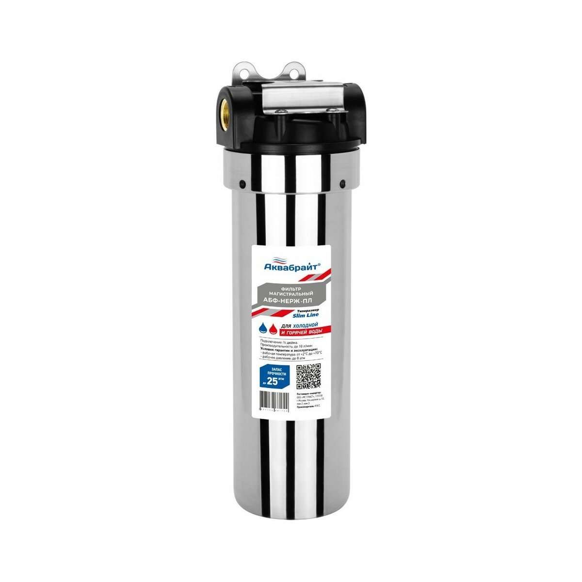 Магистральный фильтр Аквабрайт "АБФ-НЕРЖ-34-ПЛ", для холодной и горячей воды 10"