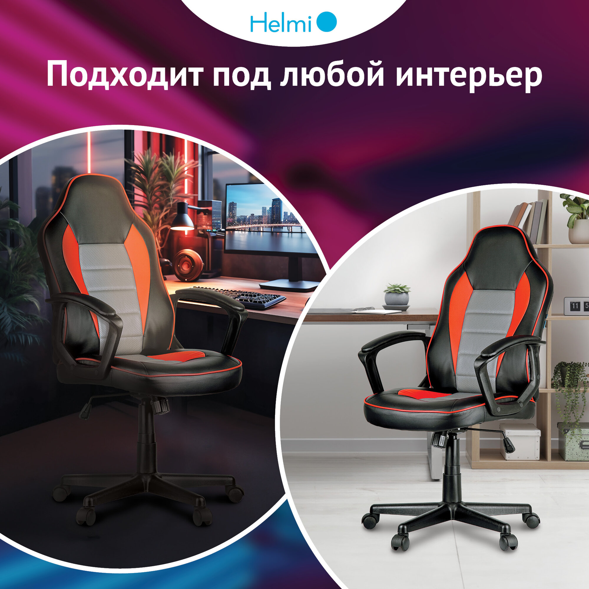 Кресло игровое Helmi "Rally", экокожа черная, серая, красная (297637)