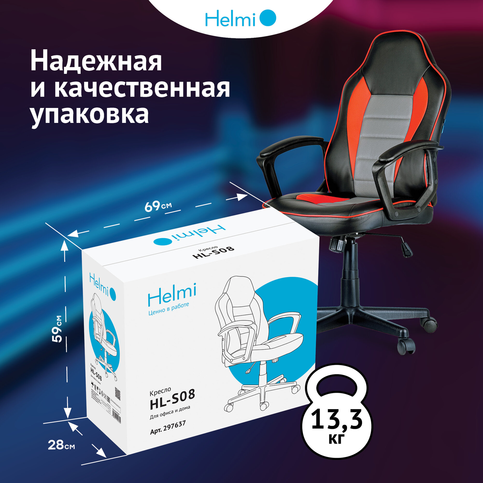 Кресло игровое Helmi HL-S08, экокожа черная/серая/красная