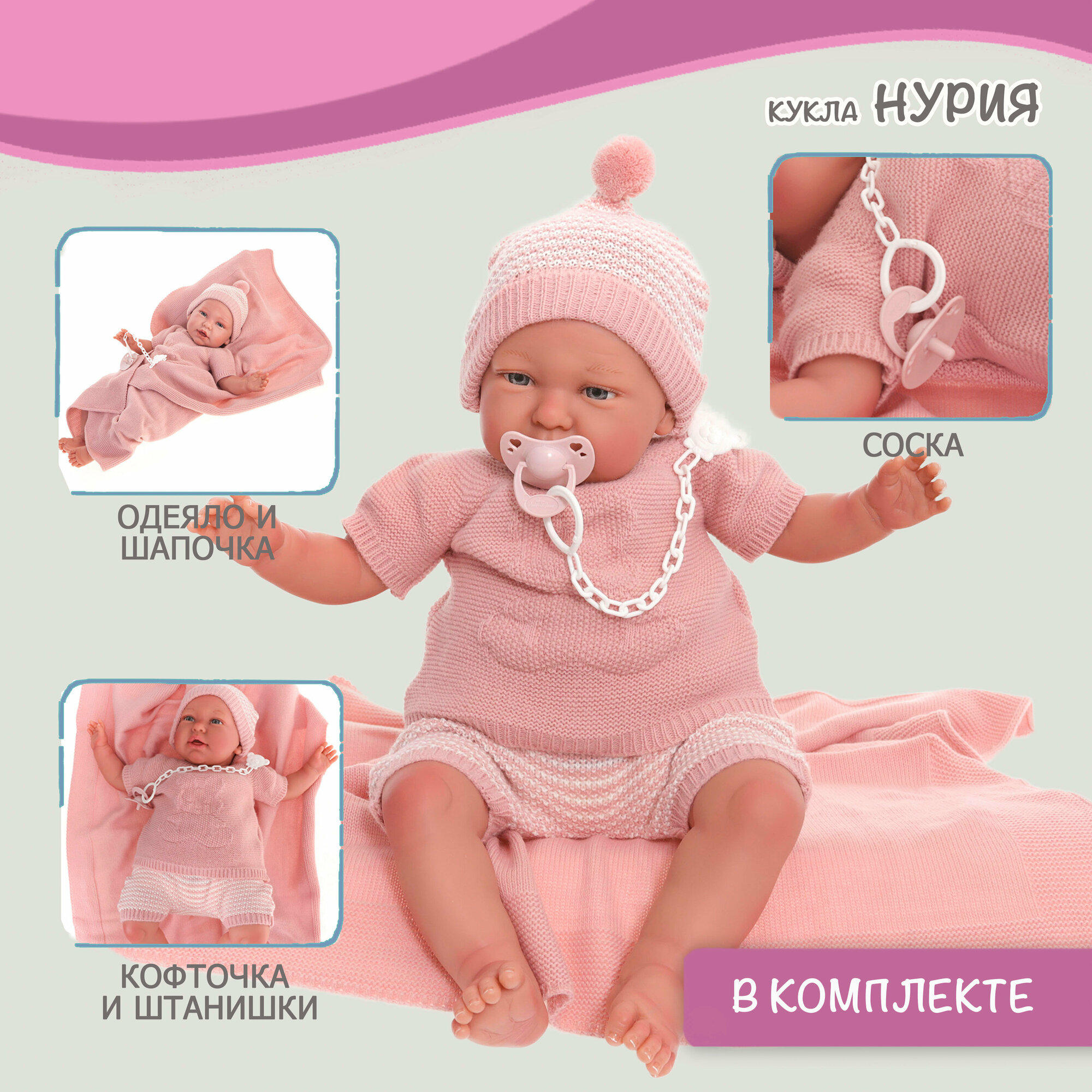 | Комплектация | кукла, шапка, кофта, штанишки, подгузник, одеяло, соска |