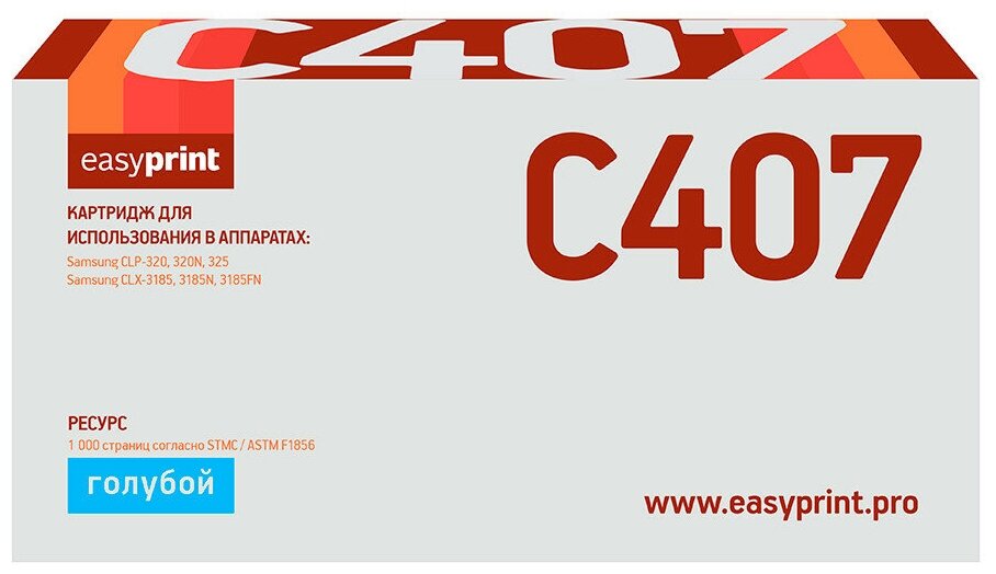 Ниже Вы можете прочитать отзывы на Картридж EasyPrint LS-C407 CLT-C407S для Samsung CLP-320 325 CLX-3185 голубой с чипом 1000стр, ознакомится с подробными характеристиками, посмотреть интересные обзоры и фотографии на Картридж EasyPrint LS-C407 CLT-C407S для Samsung CLP-320 325 CLX-3185 голубой с чипом 1000стр.