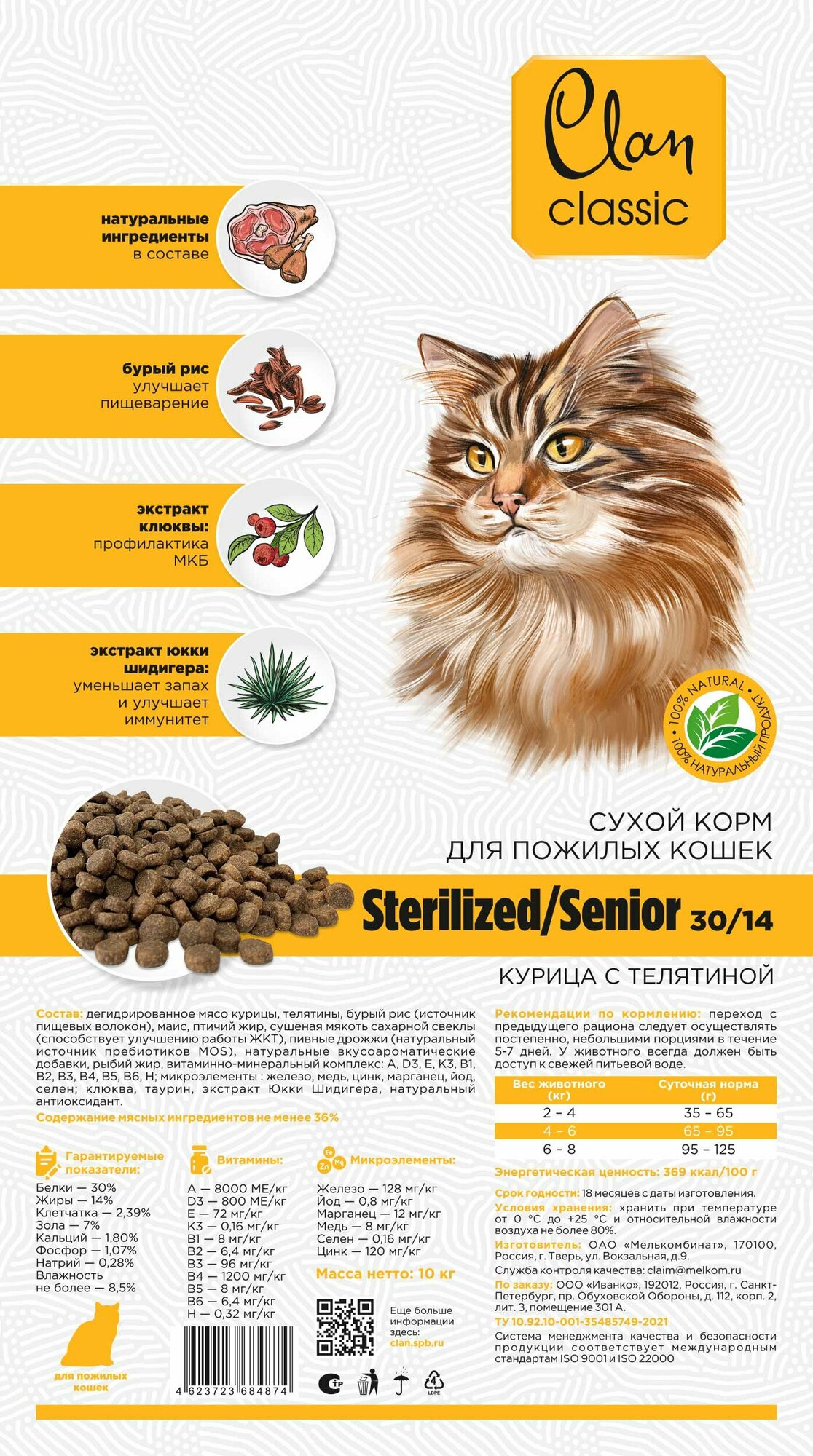 CLAN CLASSIC STERILIZED SENIOR 30/14 для пожилых кошек с курицей и телятиной (10 кг)