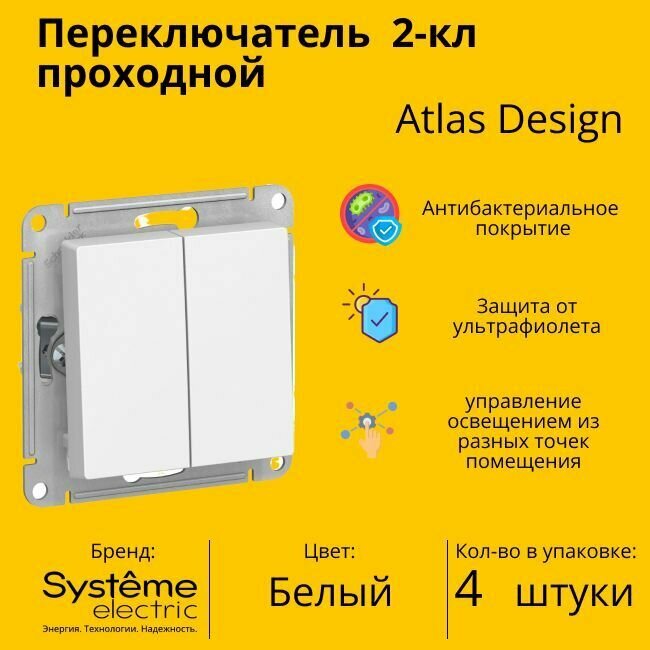 Купить Переключатель проходной Systeme Electric Atlas Design 2-клавишный, 10А, 10 AX, Белый - 4 шт.