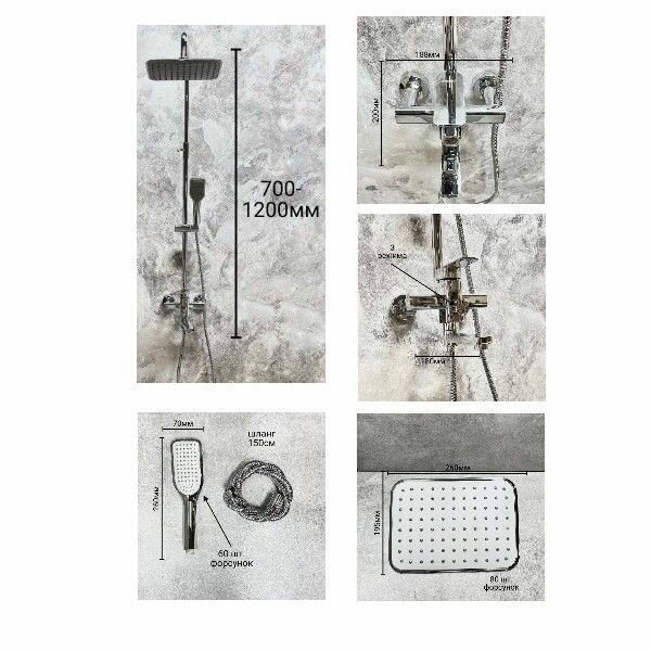| Комплектация | штанга - 1шт. / верхний душ - 1шт. / ручной душ - 1шт. / смеситель - 1шт. / излив - 1шт. |