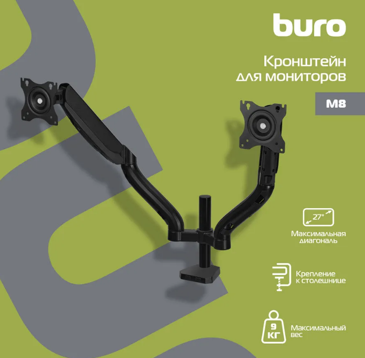 Кронштейн для мониторов ЖК Buro M8, до 27", до 9кг, крепление к столешнице, поворот и наклон, черный