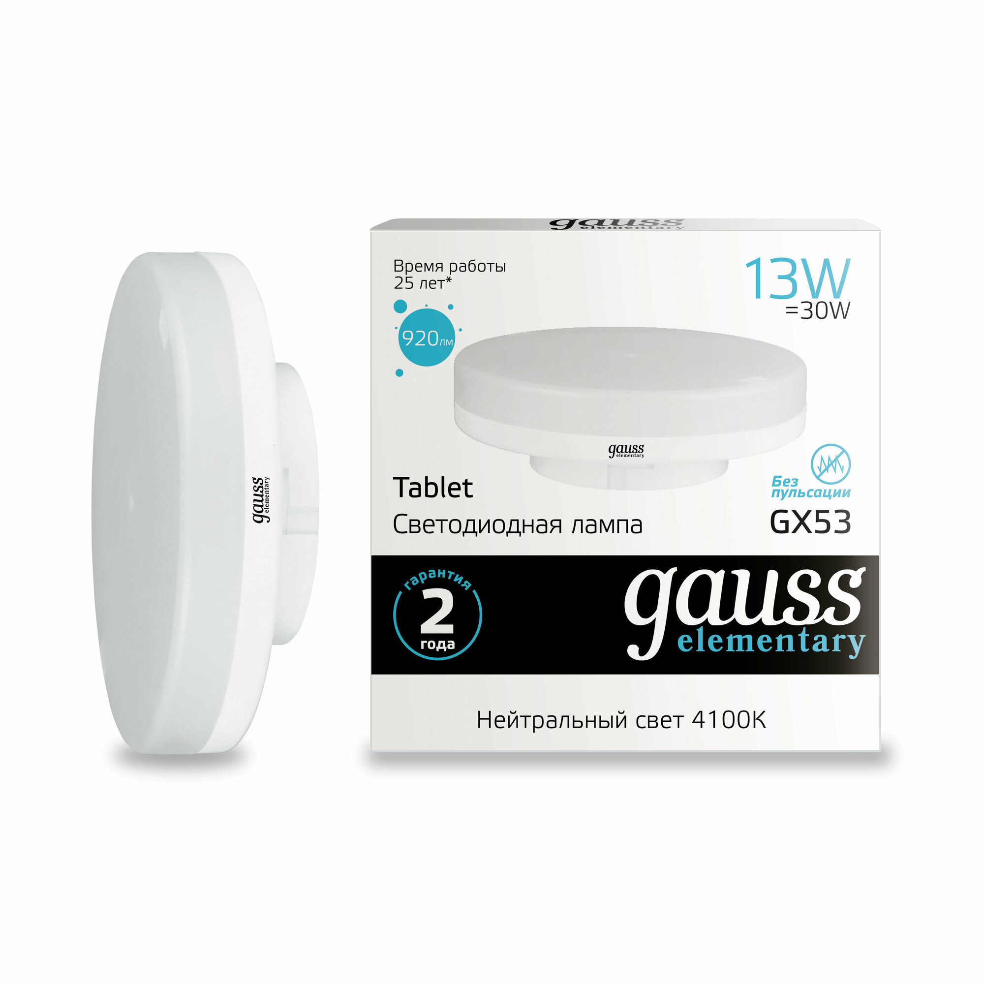 Лампа светодиодная Gauss Elementary GX53 13Вт цок.GX53 таблетка 220B 4100K св.свеч.бел.нейт. Tablet, 1 шт.