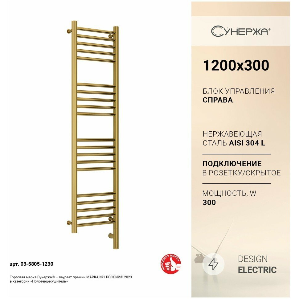 Полотенцесушитель электрический Сунержа Богема 3.0 прямая, 1200x300, МЭМ правый, золото 03-5805-1230