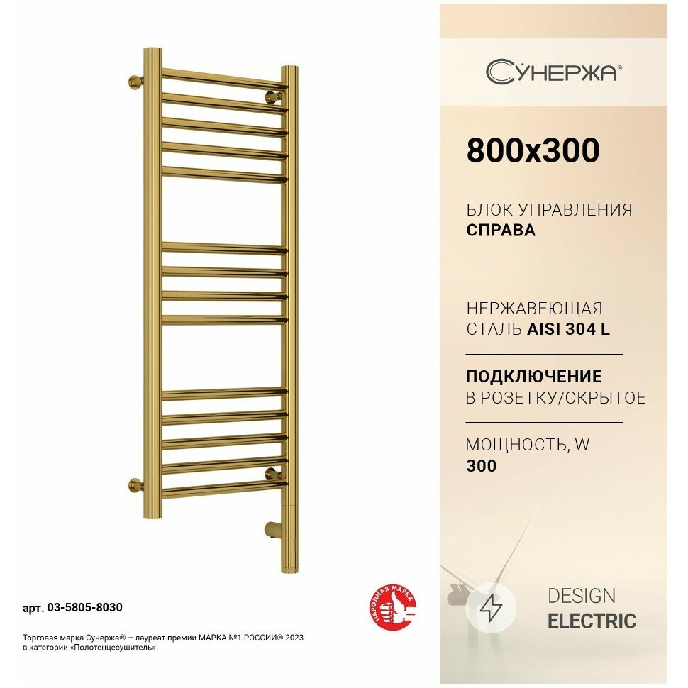 Полотенцесушитель электрический Сунержа Богема 3.0 прямая, 800x300, МЭМ правый, золото 03-5805-8030