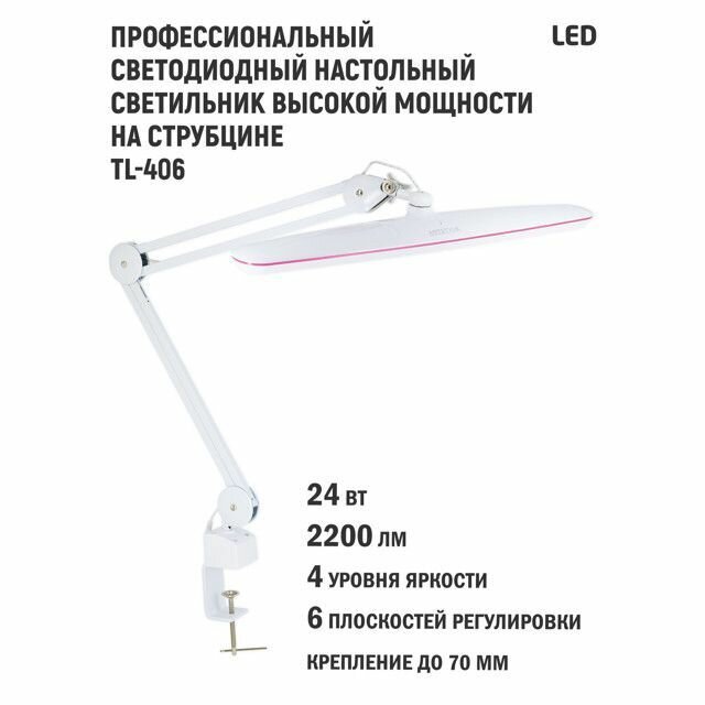 Светильник, ARTSTYLE, TL-406W, белый (профессиональный светодиодный настольный светильник высокой мощности, 24Вт, на струбцине, диммируемый)