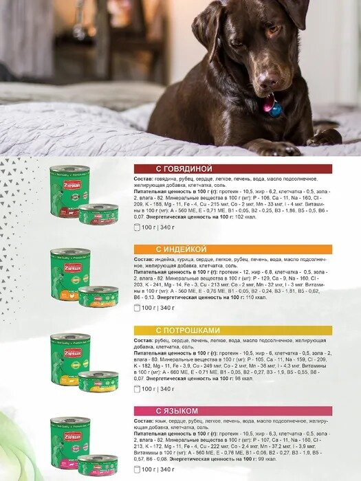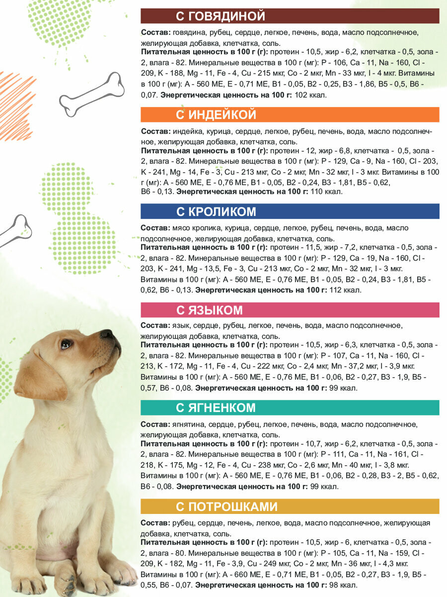 | Состав | рубец (не менее 30%), сердце (не менее 20%), печень (не менее 10%), легкое, коллагенсодержащее животное сырье, желе, масло растительное, клетчатка |