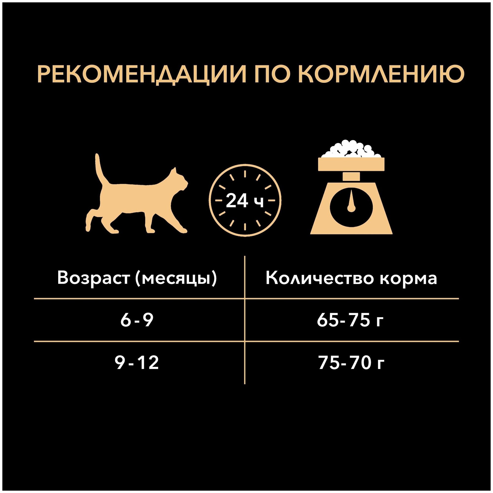 | Дополнительная информация | указанное рекомендованное количество корма (г/день) приведено в приблизительном количестве в расчете для кошки среднего веса; для котенка меньшего или большего веса, пожалуйста, измените количество корма соответственно; следите, чтобы у вашего котенка или вашей кошки всегда была чистая свежая питьевая вода |