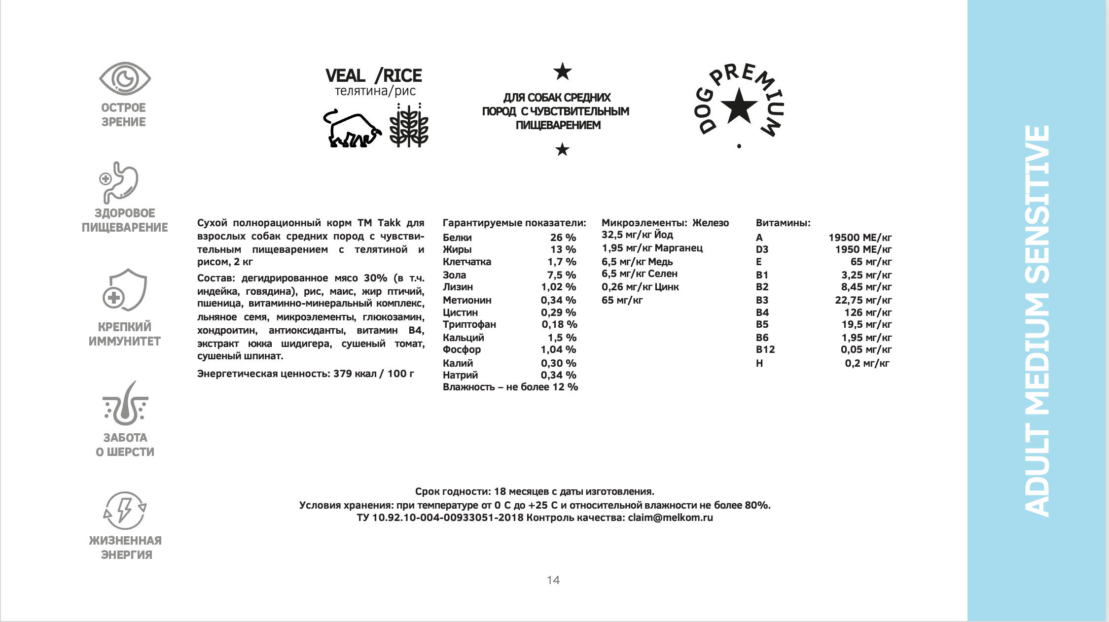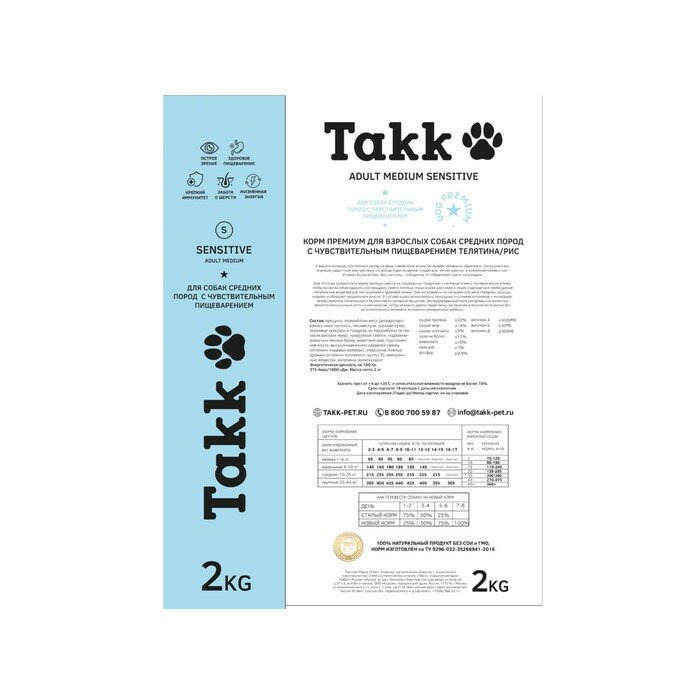 TAKK DOG ADULT MEDIUM SENSITIVE VEAL & RICE для взрослых собак средних пород с чувствительным пищеварением с телятиной и рисом (2 кг)