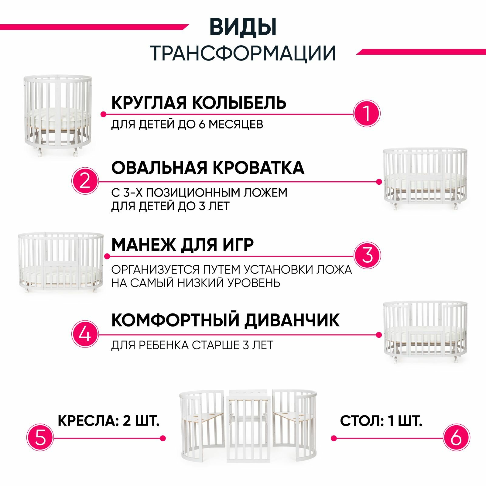 | Особенности | размер спального места овальной 125х75 см; размер диванчика 125х75 см; размер манежа 125х75 см; размер кресла 75х37 см; размер стола 75х50 см; |