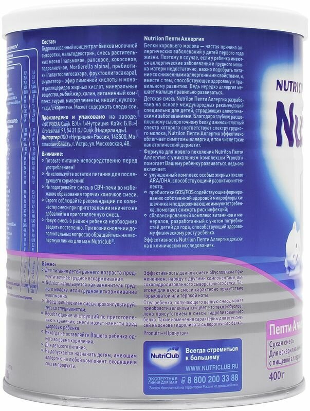 Ниже Вы можете прочитать отзывы на Nutrilon Заменитель Пепти Аллергия с рождения 400 г, ознакомится с подробными характеристиками, посмотреть интересные обзоры и фотографии на Nutrilon Заменитель Пепти Аллергия с рождения 400 г.