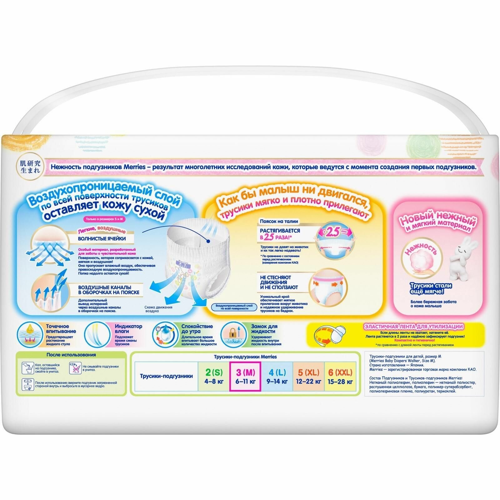 Трусики-подгузники Merries для детей размер M / 3 (6-11 кг), 58 шт, дышащие
