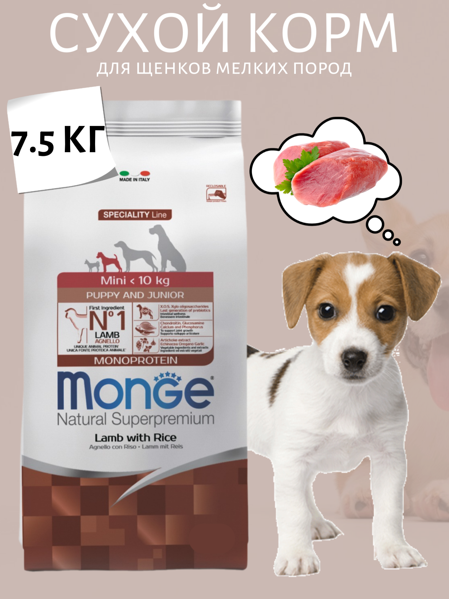 Сухой корм для щенков Monge Speciality line Dog Monoprotein MINI PUPPY & JUNIOR LAMB WITH RICE, ягненок, c рисом, 7.5 кг (для мелких пород)