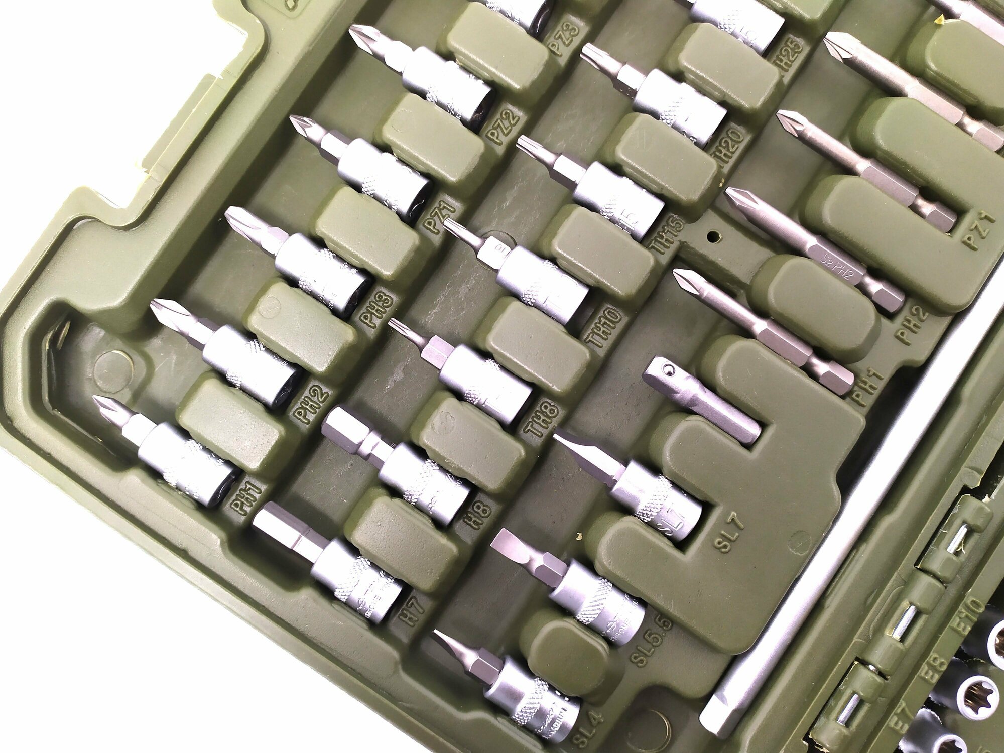 | Аксессуары в комплекте | бита-адаптер для торцевых головок / гибкий удлинитель для головок / держатель для бит / телескопический магнитный щуп / удлинитель для головок / шарнир карданный для головок |
