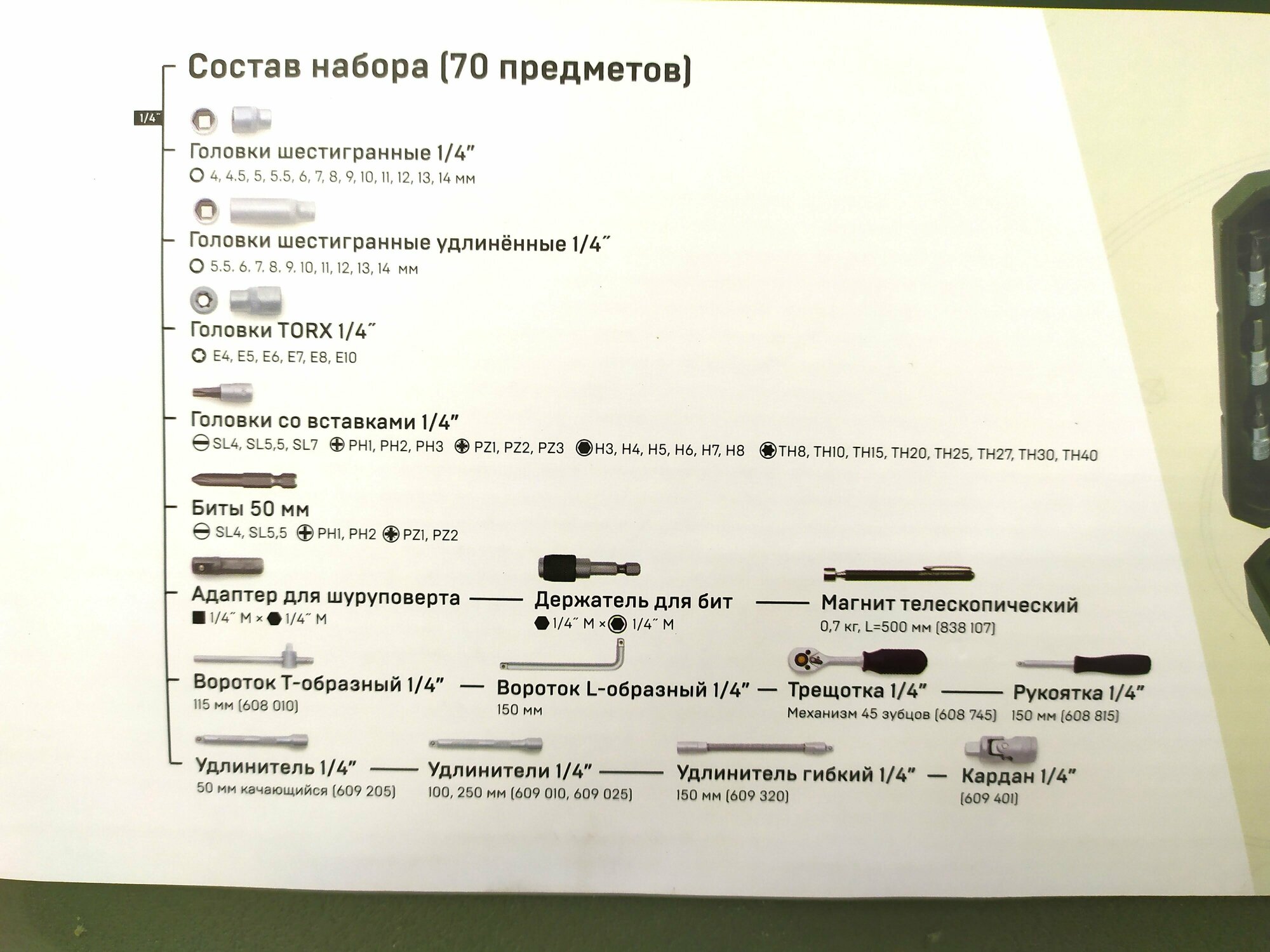 | Головки торцевые подробно | 1/4˝: 4; 4,5; 5; 5,5; 6; 7; 8; 9; 10; 11; 12; 13, 14 мм; шестигранные удлинённые 1/4˝: 5.5, 6, 7, 8, 9, 10, 11, 12, 13, 14 мм; 1/4˝: E4, E5, E6, E7, E8, E10 |