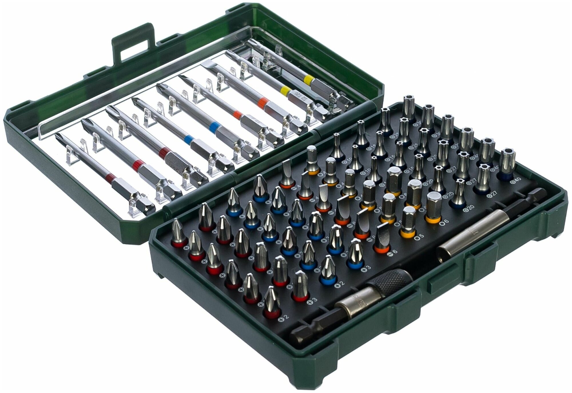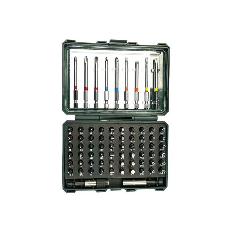 | Биты подробно | 25 мм: PH1 (3 шт), PH2 (6 шт), PH3 (3 шт); PZ1 (3 шт), PZ2 (6 шт), PZ3 (3 шт); SL4 (3 шт), SL6 (3 шт); H4 (3 шт), H5 (3 шт), H6 (3 шт); T10 (3 шт), T15 (3 шт), T20 (3 шт), T25 (3 шт), T27 (3 шт), T30 (3 шт), T40 (3 шт); 75 мм: PH1, PH2, PH3, PZ1, PZ2, SL4, SL6, T20, T25 |