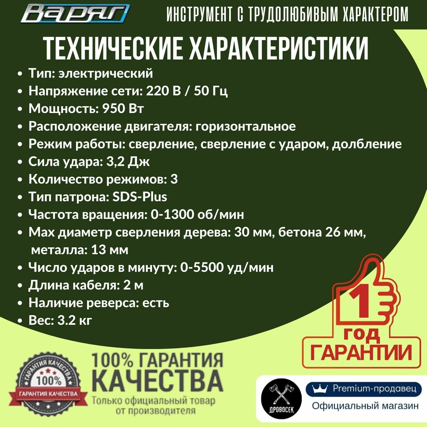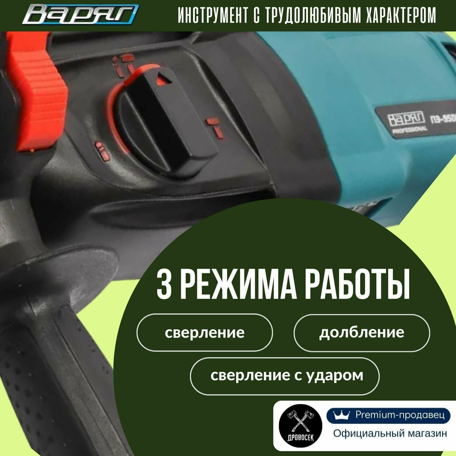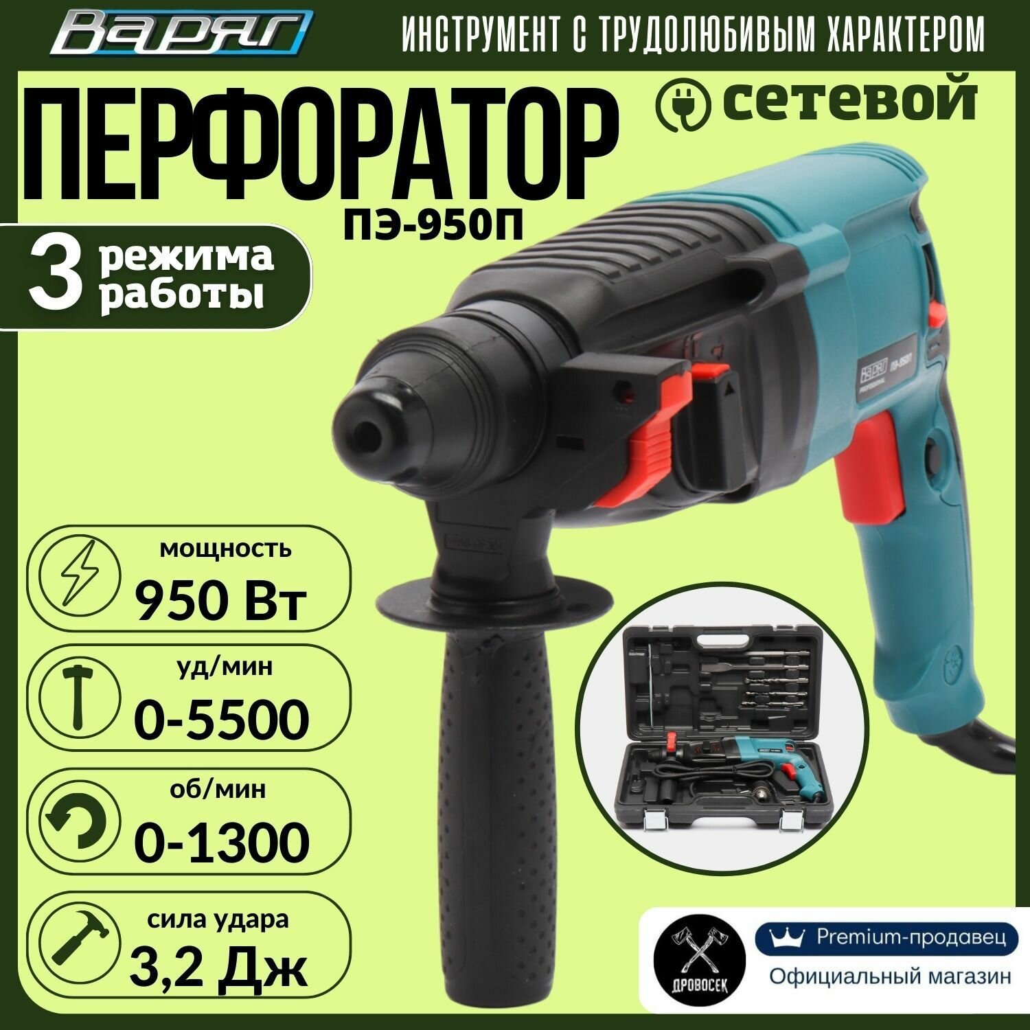 Перфоратор Варяг ПЭ-950П электрический (950Вт, 0-1300об/мин, 0-5500уд/мин, 3,2Дж, 3 реж, SDS+) в кейсе, от сети, подарок мужчине