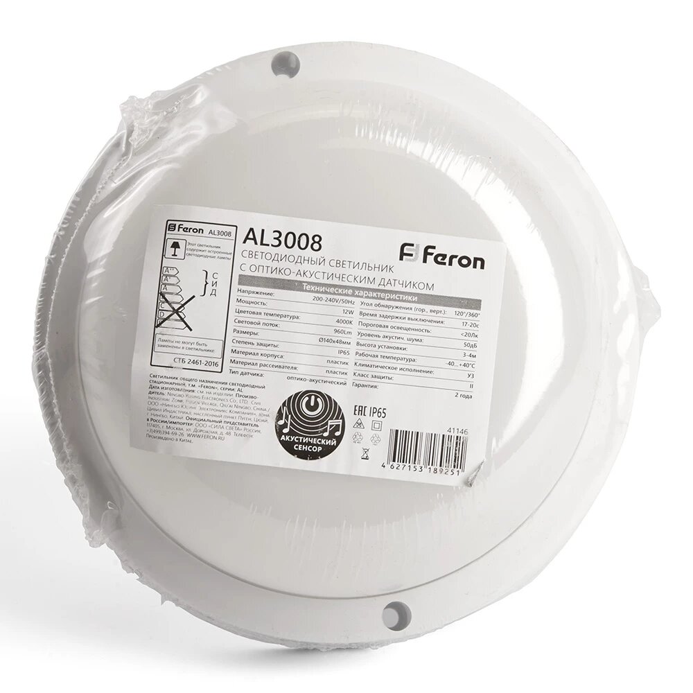Светильник светодиодный пылевлагозащищённый с оптико- акустическим датчиком Feron AL3008 в пластиковом корпусе 12W 4000K 220V IP65 белый FERON 41146 (1 шт.) интересное: