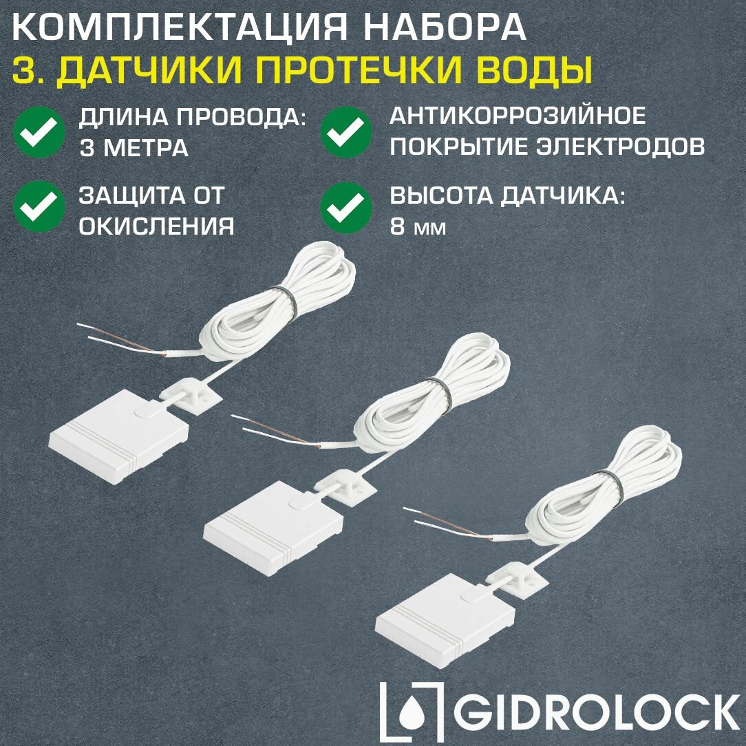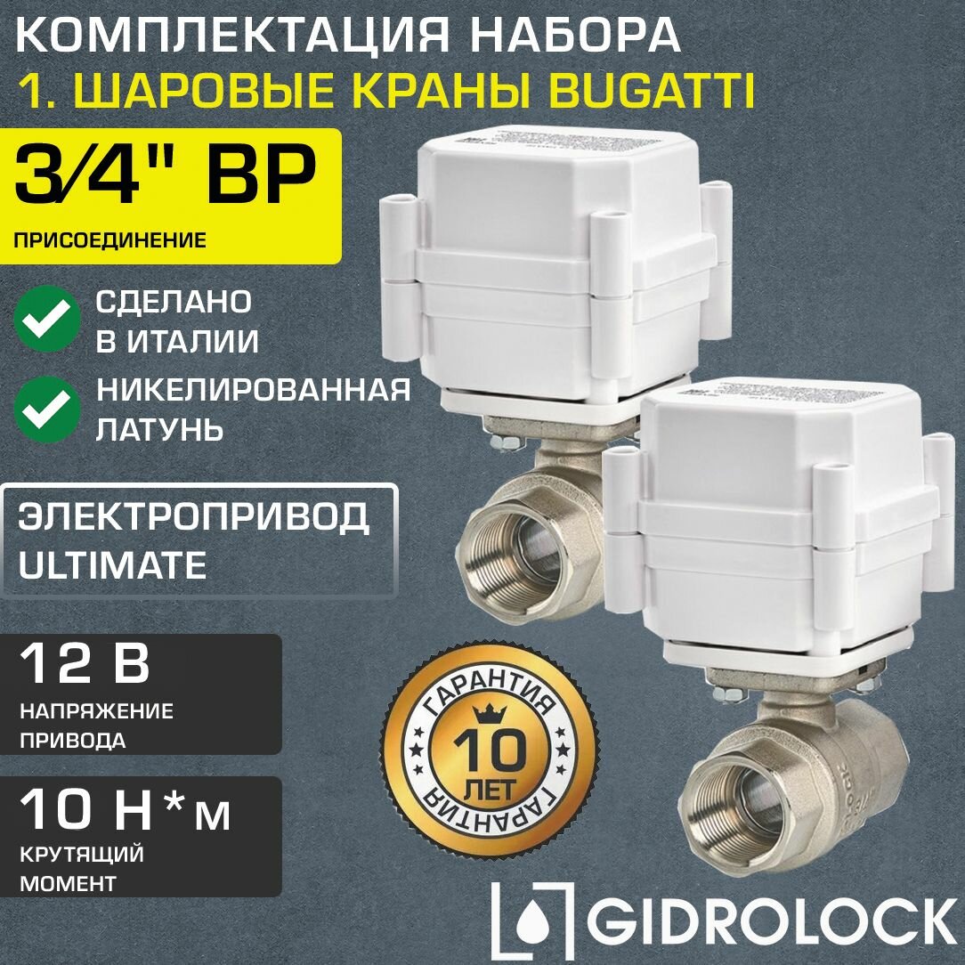 Купить Комплект Gidrolock Wi-Fi с 2 кранами 3/4" Bugatti с электроприводом 12V - Система защиты от протечек (потопа) в доме и квартире с проводными датчиками утечки воды (3 м провод), 36201022