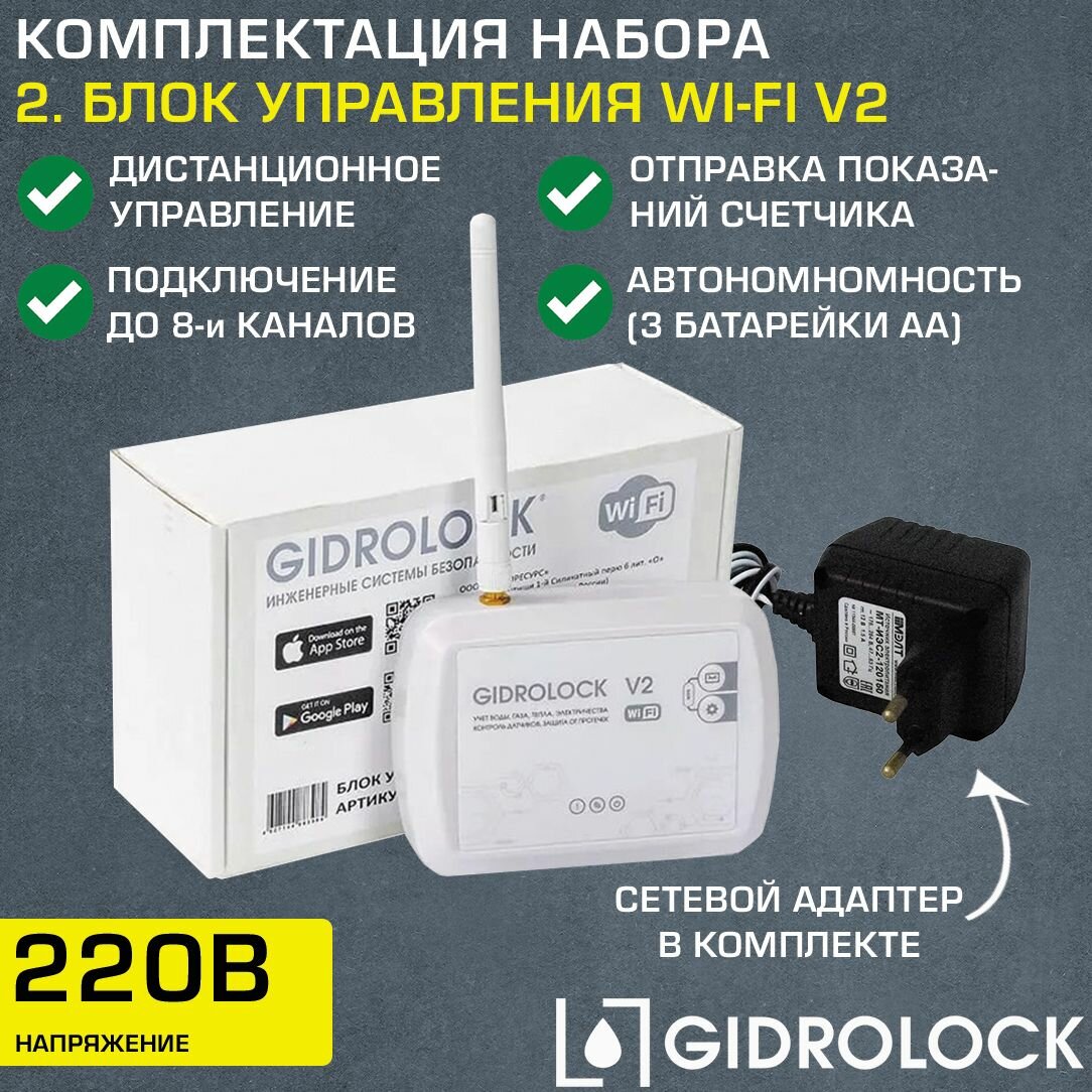 | Подробная комплектация | Комплект Гидролок WiFi состоит из: Блок управления Гидролок WiFi V2 - 1шт Блок питания 1,5А - 1шт Шаровый кран 3/4" (ДУ20) Bugatti с электроприводом Ultimate 12В - 2шт Датчик воды WSP 3м - 3шт |