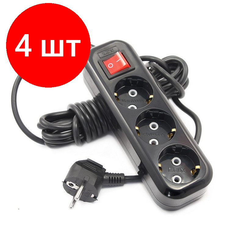 Купить Комплект 4 штук, Удлинитель LUX У3-ЕВК-03 с выкл. 3-мест с з/к, 250В 16А, 3м, черный